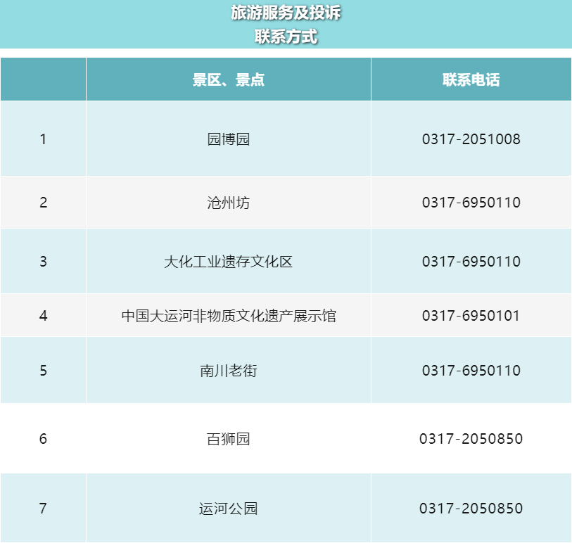 為了更好地服務(wù)大家,保障大家在滄州大運河的游玩體驗,現(xiàn)公布以下相關(guān)地點的旅游服務(wù)及投訴聯(lián)系方式,在這里您可以反饋各類問題和意見,若您在游玩過程中遇到任何不盡如人意之處,請及時聯(lián)系我們。