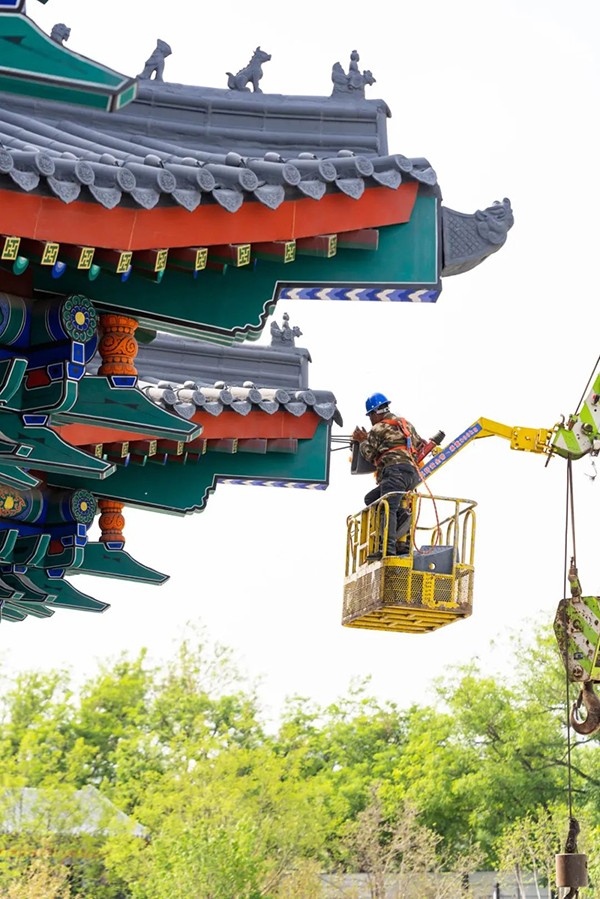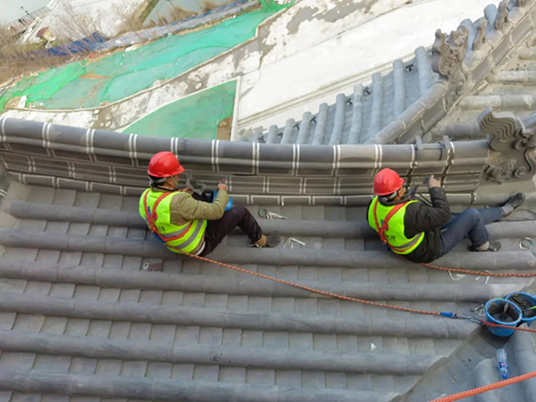 為確保南川樓、朗吟樓門窗及護(hù)欄呈現(xiàn)二朱色效果,現(xiàn)場(chǎng)負(fù)責(zé)人往返廠家十余次,歷經(jīng)15次調(diào)漆、樣塊噴涂,實(shí)現(xiàn)了兩樓“閃電變身”。南川樓、朗吟樓樓頂?shù)拿恳黄叨际枪と藥煾蛋凑帐┕こ叽缫?,及多年古建施工?jīng)驗(yàn)一片一片挑選而出,為防止樓頂削割瓦出現(xiàn)滾隴、跳隴,工人們采用掛線方式以確保瓦片直線度,在鋪好的瓦峰兩邊貼上美紋紙進(jìn)行填縫,一瓦一縫盡顯匠人精神。