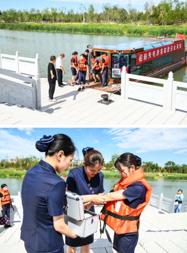 模擬游船在運(yùn)行中出現(xiàn)電力故障無(wú)法運(yùn)行的情況。青年志愿者、講解員、電力保障工作人員各司其職,迅速開(kāi)展游客安撫、船只調(diào)度、游客轉(zhuǎn)移、電力檢修等應(yīng)急措施。