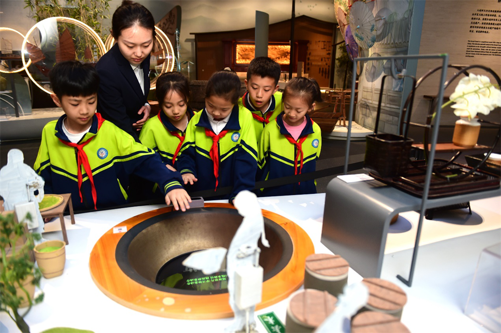 滄州車站小學(xué)的小學(xué)生走進中國大運河非遺展示館了解茶的炒制技藝。傅新春攝