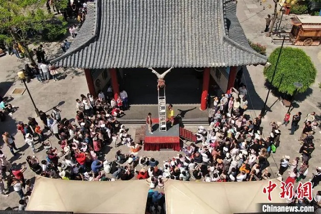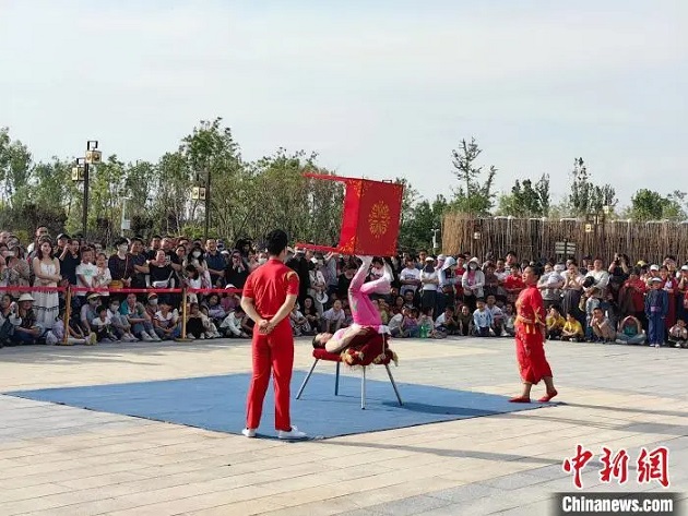 5月2日,吳橋雜技大世界景區(qū)內(nèi),雜技演員展現(xiàn)絕技。郝亮 攝