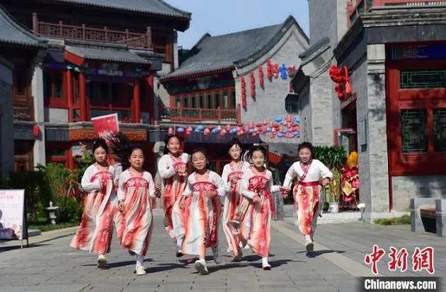 5月1日,幾名身穿古裝的兒童在滄州坊商街游玩。傅新春 攝
