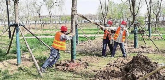 昨天上午,在百獅園植樹(shù)現(xiàn)場(chǎng),一派忙碌景象。參加植樹(shù)的工人們鏟土、培土圍堰、提水澆灌,接連種下海棠、油松等樹(shù)木。