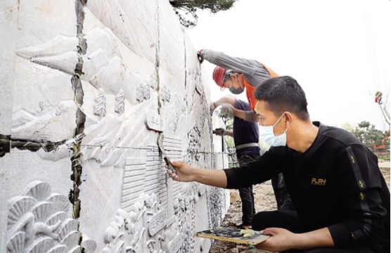 工人為獅子浮雕墻優(yōu)化細(xì)節(jié)