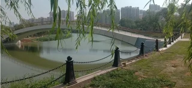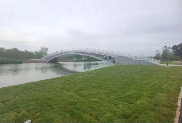 連接百獅園與南川樓的步行橋 連接運(yùn)河公園與佟家花園的步行橋。 連接運(yùn)河公園與清池南大道的步行橋。 位于運(yùn)河公園東南方向的步行橋也具備了通行條件。這座橋在原來(lái)臨時(shí)浮橋的位置修建,連接運(yùn)河公園和清池南大道。這座橋設(shè)計(jì)新穎,充滿現(xiàn)代感,采用了新型材料。拱橋外側(cè)采用鋁合金仿木裝飾漸變形式,橋面為弧線型,并設(shè)置踏步。兩側(cè)欄桿不同于其他幾座橋,采用的是合金材料欄桿加木制扶手,在現(xiàn)代感中增加了一些傳統(tǒng)元素。這座步行橋?qū)?.5米,凈跨徑為單跨50米。這座橋建成后,便于運(yùn)河?xùn)|岸的居民到運(yùn)河公園游玩。