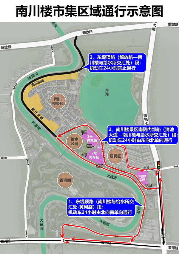 2.南川樓景區(qū)南側(cè)內(nèi)部路(清池大道—南川樓與給水所交匯處)實(shí)行機(jī)動(dòng)車輛24小時(shí)由東向北單向通行。