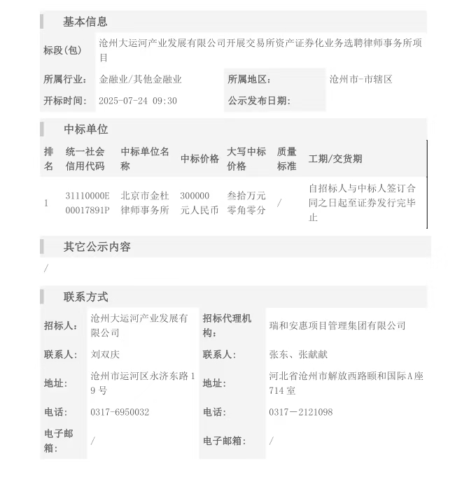 滄州大運河產(chǎn)業(yè)發(fā)展有限公司開展交易所資產(chǎn)證券化業(yè)務選聘律師事務所項目