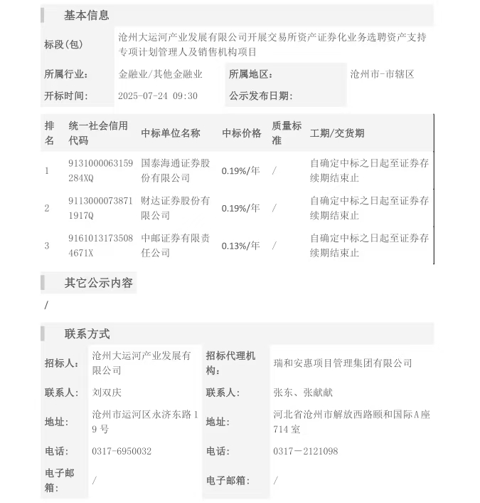 滄州大運(yùn)河產(chǎn)業(yè)發(fā)展有限公司開(kāi)展交易所資產(chǎn)證券化業(yè)務(wù)選聘資產(chǎn)支持專(zhuān)項(xiàng)計(jì)劃管理人及銷(xiāo)售機(jī)構(gòu)項(xiàng)目