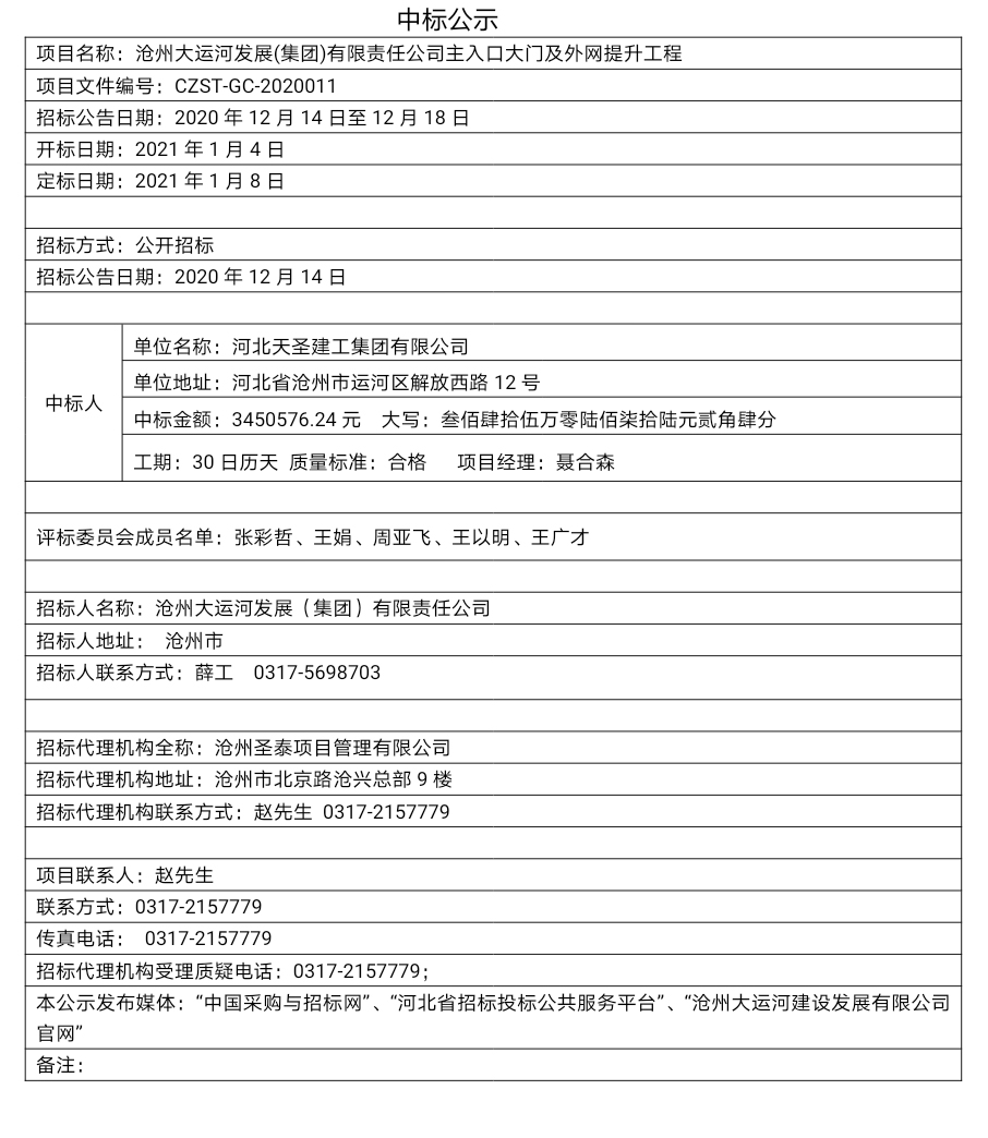 關(guān)于滄州大運(yùn)河發(fā)展(集團(tuán))有限責(zé)任公司主入口大門(mén)及外網(wǎng)提升工程的中標(biāo)公示
